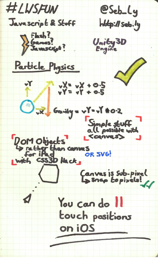 Last night was London Web Standards' April 2011 event, Fun with JavaScript. Speakers Rob Hawkes of Mozilla and Seb Lee-Delisle of Plug-in Media came to talk about all the fun stuff you can do with JavaScript, canvas, and HTML5. Sketchnotes for both talks are below.