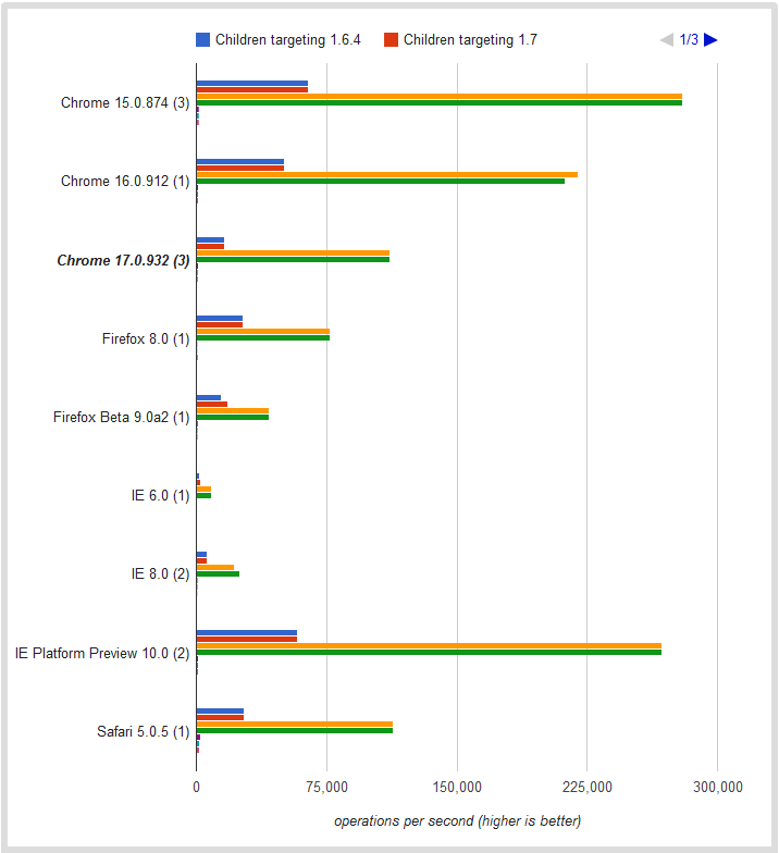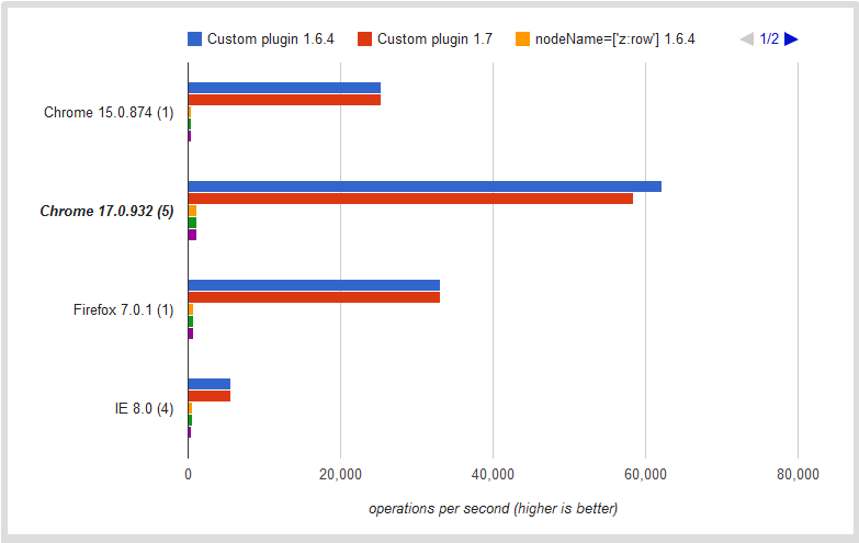 I mean, wow, that's incredible. On the graph, those tiny little bits of colour are the original selectors, and those only 20% of the way up are the previous massive performance increase by using filter. It should also be noted that IE8 performance using this selector increased in jQuery 1.7 in comparison to when using jQuery 1.6.